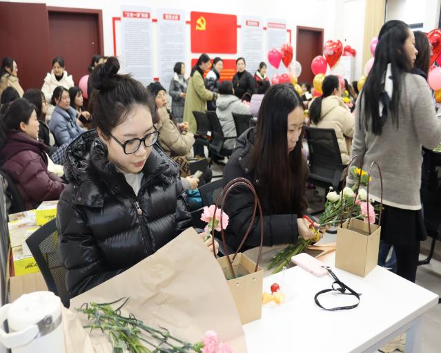 巧手编织春意,插花环节是本次活动的重头戏。活动特别邀请了资深花艺师进行现场教学,从花材的选择、色彩的搭配到造型的设计,花艺师耐心讲解,手把手指导。参与者们兴致勃勃,充分发挥自己的创意,将一朵朵鲜花巧妙组合,制作出独具匠心的花艺作品,她们一边展示着自己的劳动成果,一边用手机记录下这“人面鲜花相映红”的美好瞬间。活动现场花香四溢,春意盎然。